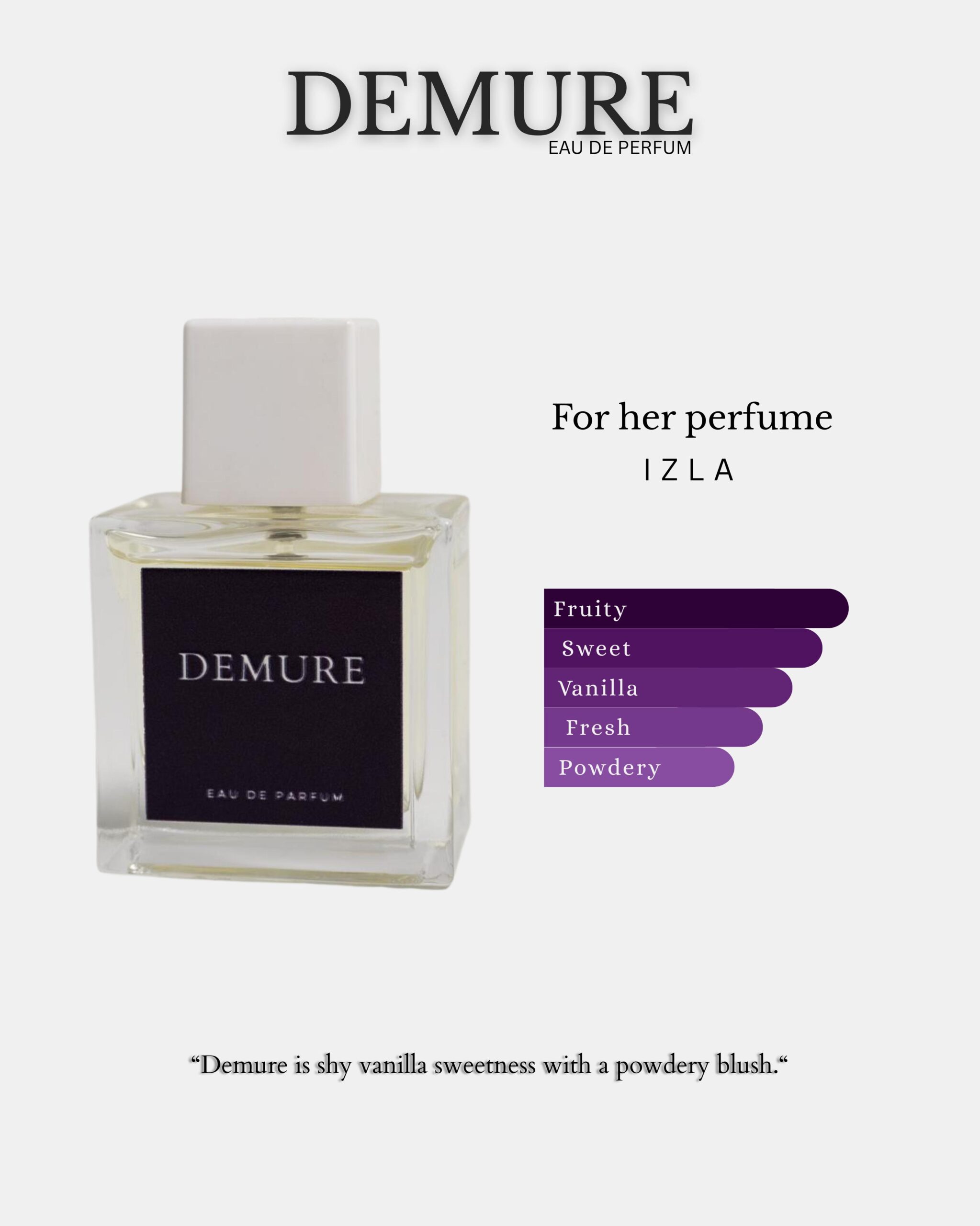 demure: fruity, sweet, vanilla, fresh and powdery