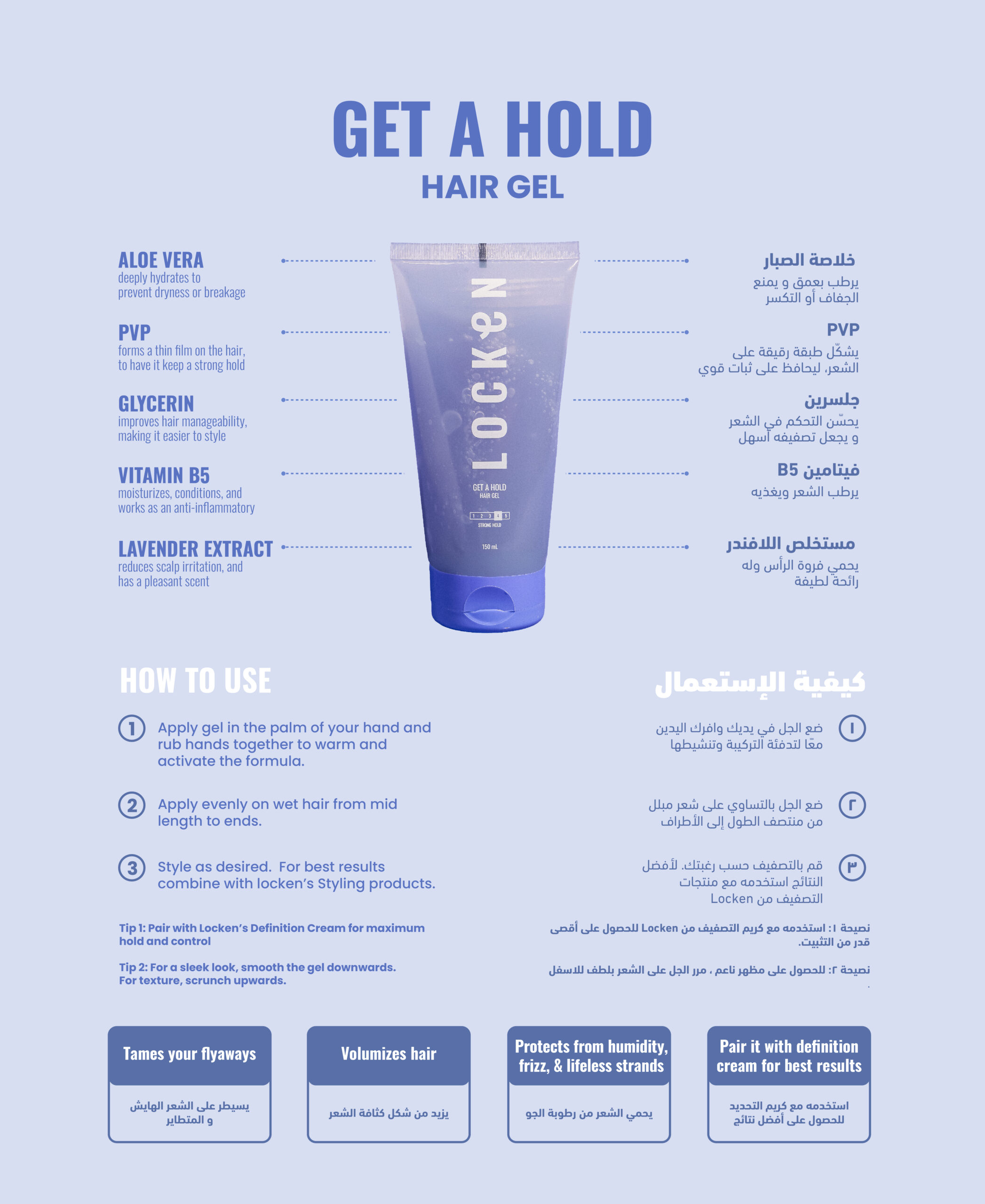 Shape your hair with Locken’s Get a Hold Hair Gel. Infused with a natural blend of Aloe Vera, Lavender and Linseed oil, this rich formula tames your flyaways and volumizes your hair, protecting it from humidity, frizz and lifeless strands.