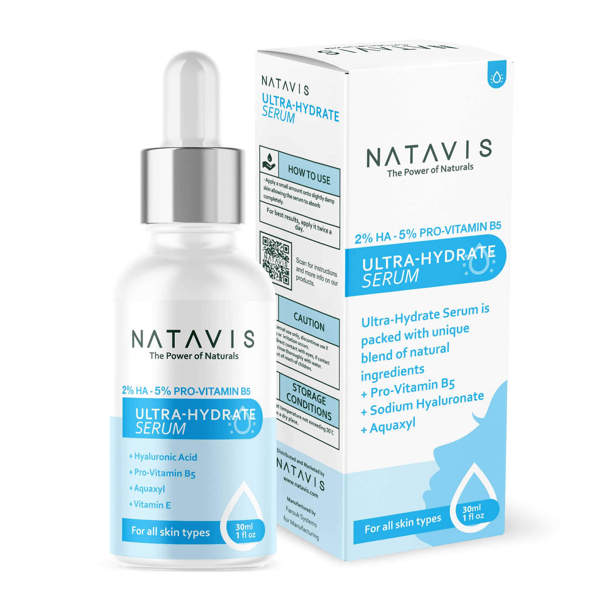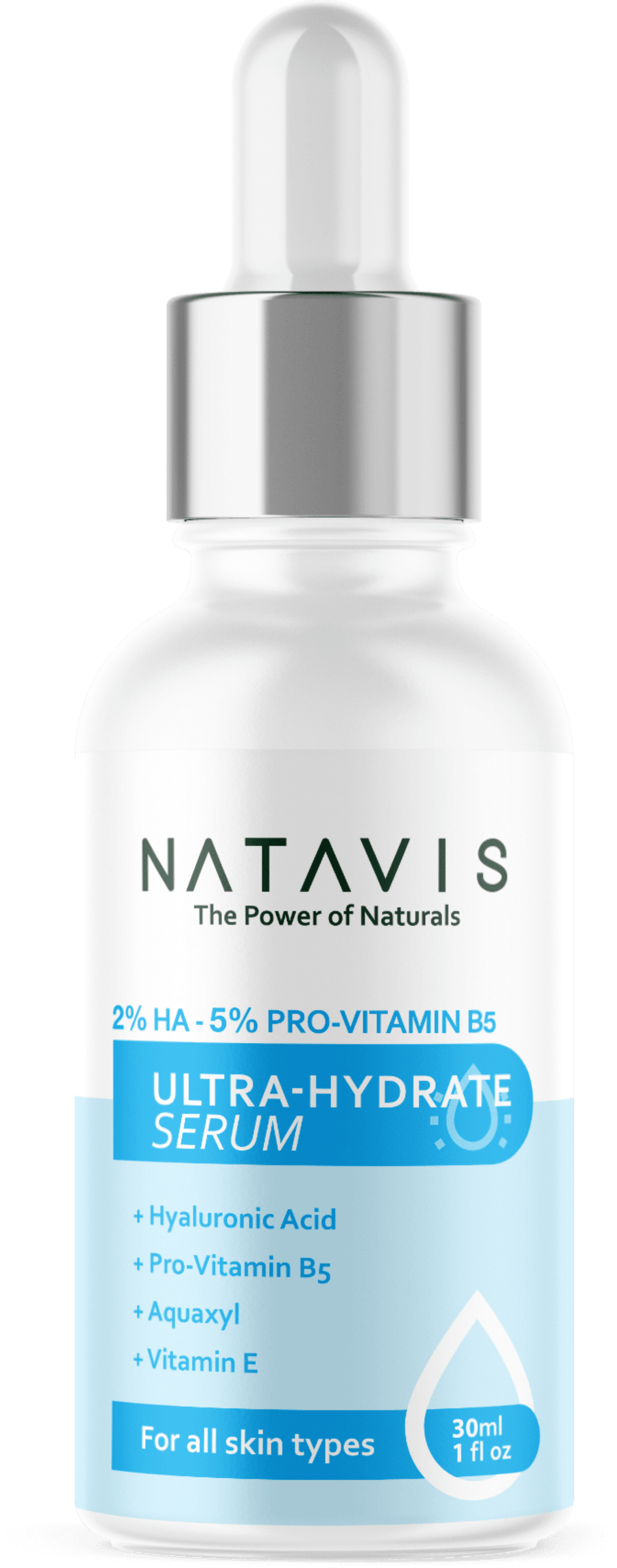 Natavis Ultra-hydrate serum, Hyaluronic acid serum with 3 most innovative powerful humactant and hydrating ingredients, 2% Hyaluronic acid, 3% Aquaxyl, 5% Panthenol (Pro-Vitamin B5), Best face serum for moisturizing, optimizing water circulation within skin layers, boosting ceramides production. For plumping, hydrating, smoothing fine lines for glowy skin.