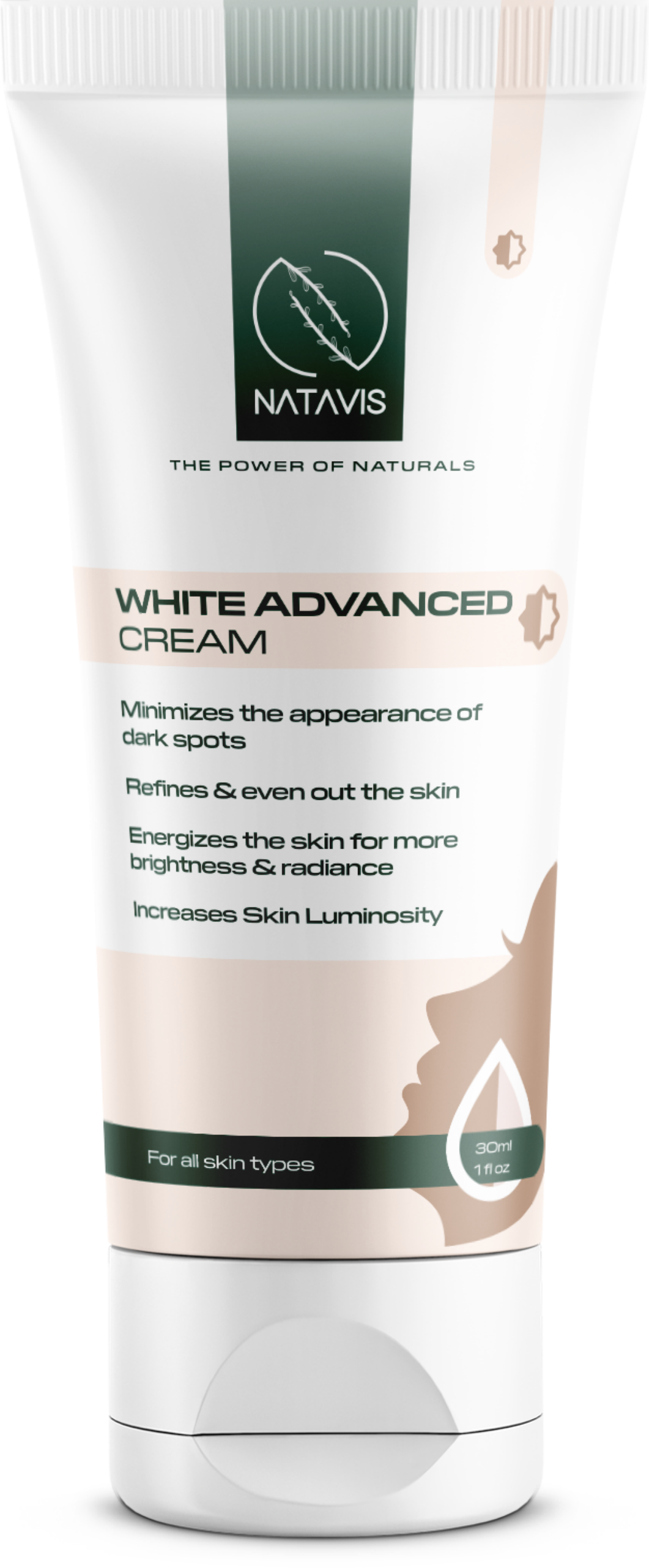 Natavis White Advanced Cream, Dark spot correcter, infused with the potent whitening ingredients, Sepiwhite MSH (Undecylenoylphenylalanine), Niainciamide and AHA blend. Minimizes the appearance of dark spots, evens-out the skin, increases skin luminosity.