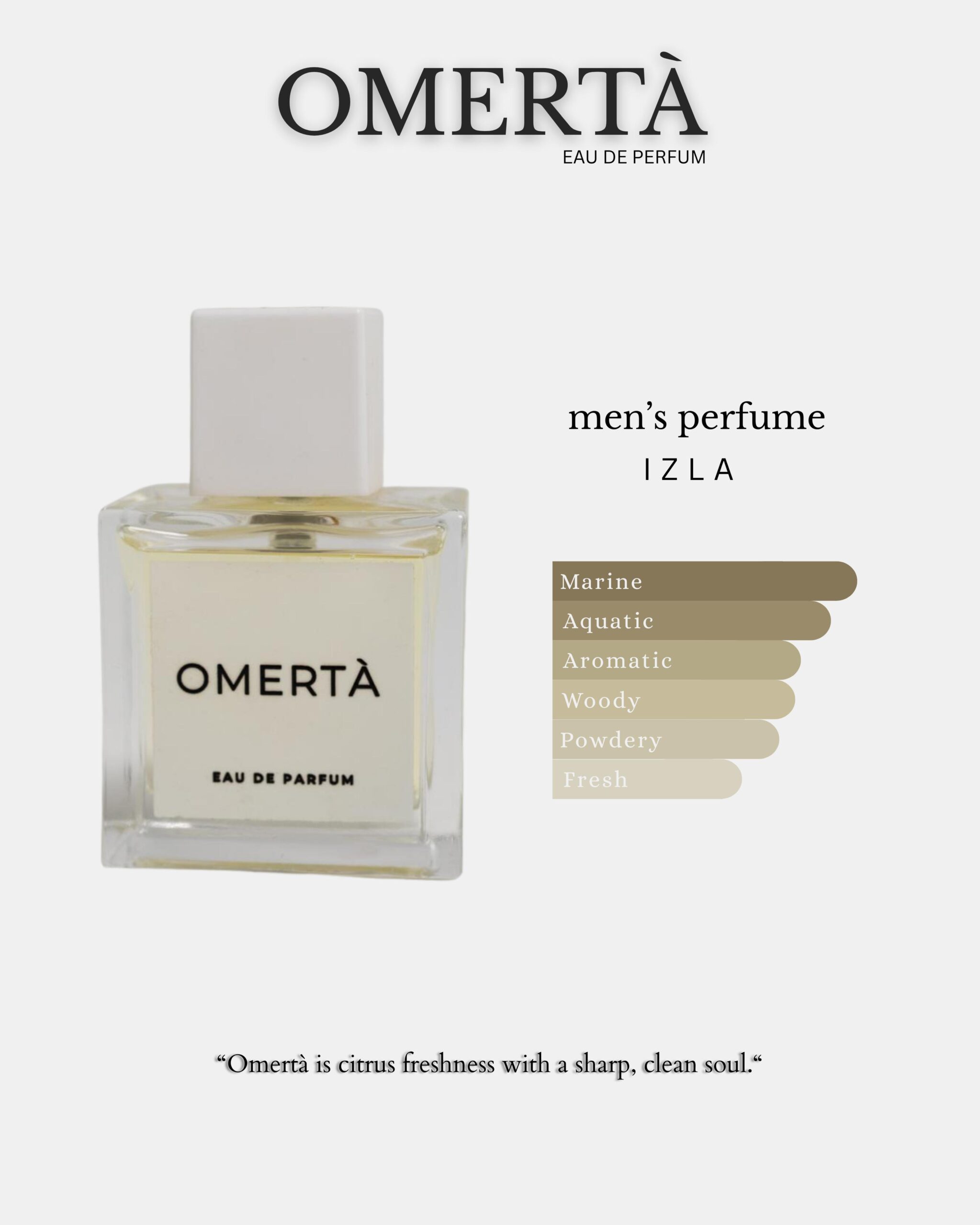 Omertà is a distinctive fragrance with a fresh and vibrant character. Its blend of citrus, bergamot, mandarin, and patchouli, along with fresh aquatic, musk, woody, and lavender notes, creates a crisp, elegant scent that feels both modern and timeless.