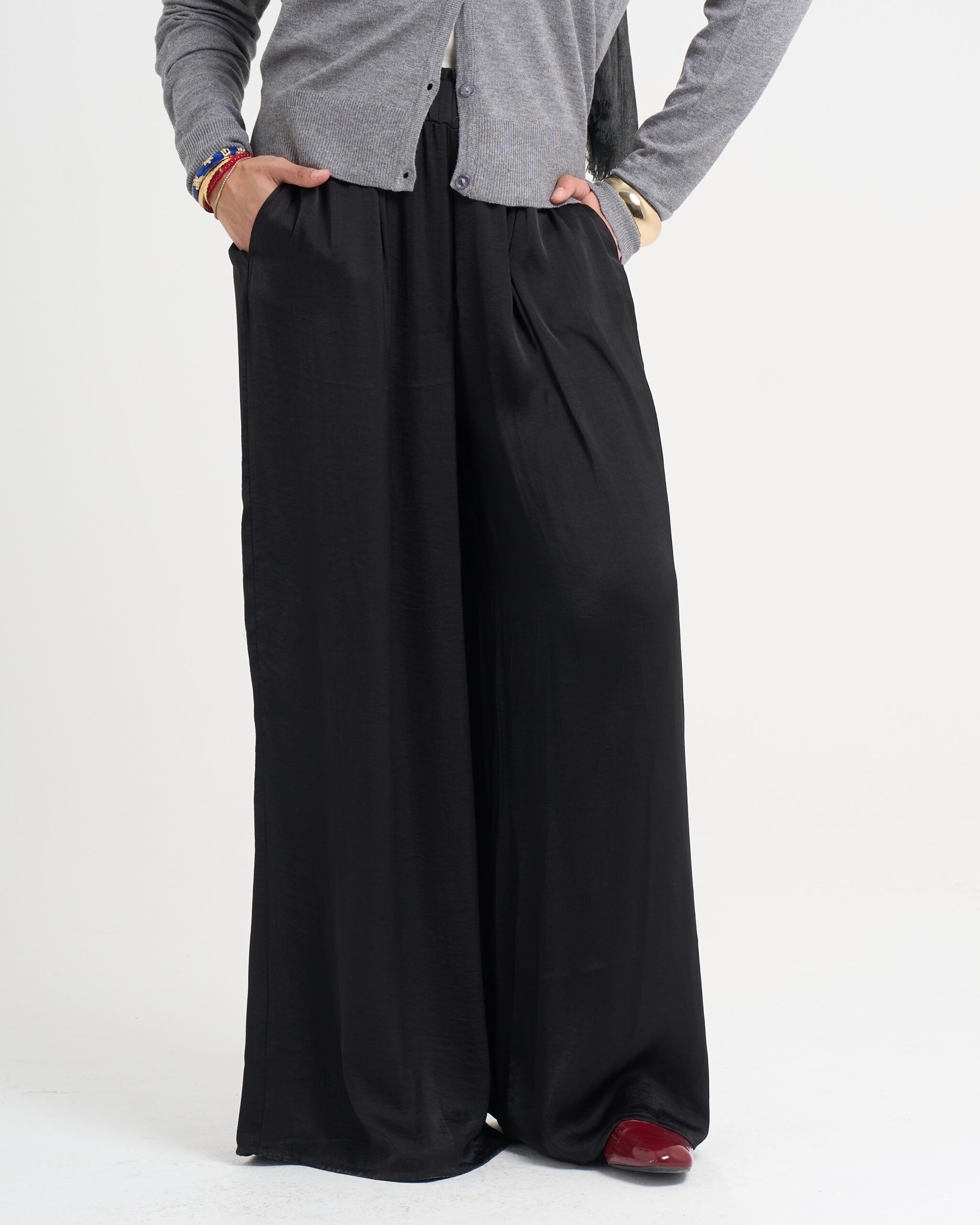 Flowy satin pants with a soft sheen and relaxed fit. Designed to move beautifully.