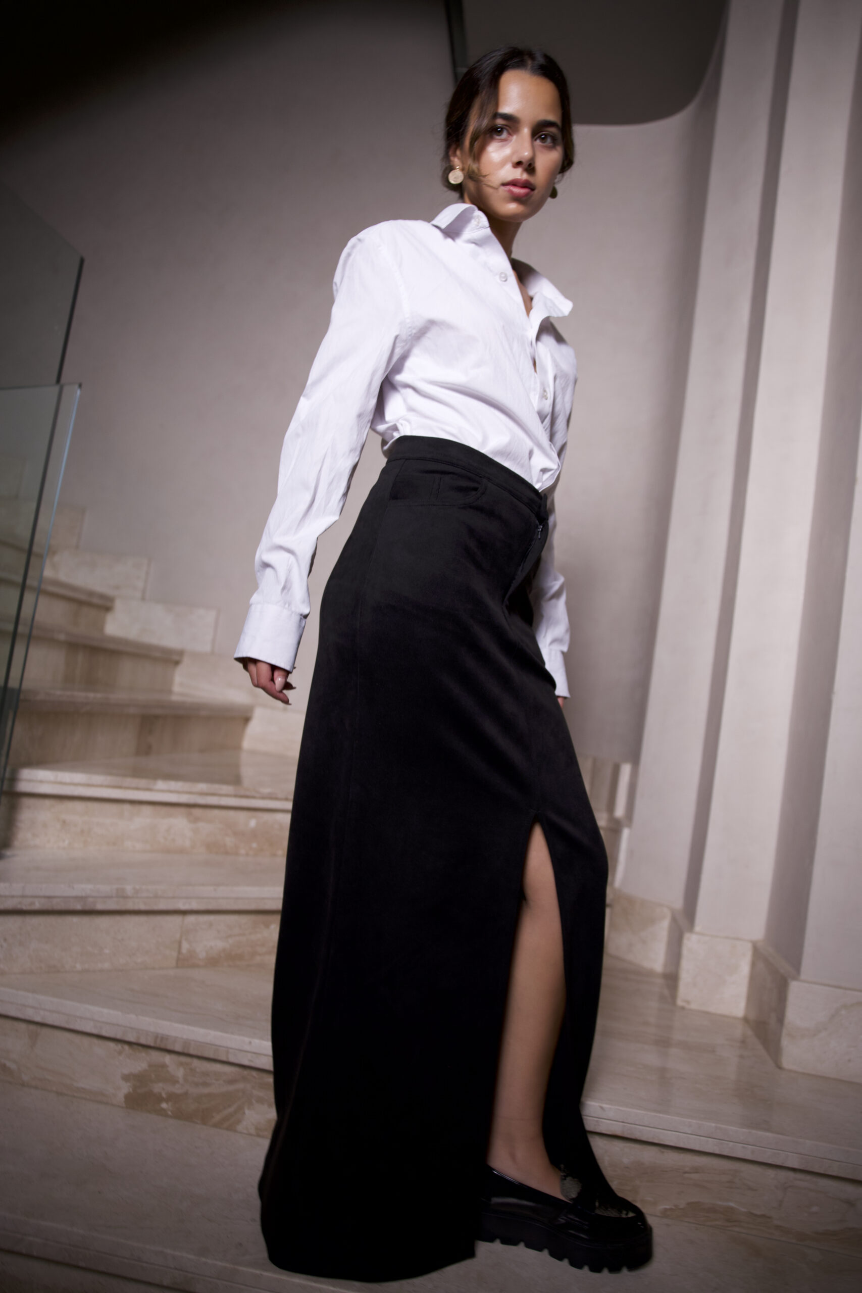 Fitted waist with button and zip closure, Front slit